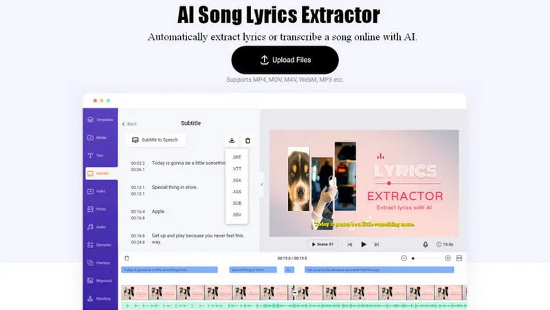 Das nächste Tool, das Songtexte aus Audio extrahieren kann, ist VEED. Dieses hilfreiche Tool kann Songtexte mühelos auslesen, da das Layout leicht zugänglich und einfach zu bedienen ist. Zudem stellt es sicher, dass du die korrekten Songtexte erhältst, da die Genauigkeit hoch ist. Du kannst dieses Tool auch nutzen, wenn du deinem Video Untertitel hinzufügen möchtest.