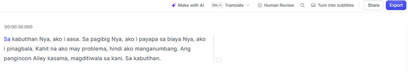 Schritt 3. Nach Abschluss des Vorgangs klicke auf die Schaltfläche See Transcript, um die Songtexte zu sehen. Klicke anschließend auf „Export“, um deine Songtexte auf deinem Gerät zu speichern.